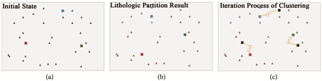 Here, Figure 3 is taken as the example to show the clustering process of K-means petrophysical data. In Figure 3(a), the black triangles are labeled in two-dimensional space with two-dimensional eigenvectors as coordinates. They can be regarded as examples reflected by two-dimensional data (composed of the data of two logging curves), that is, primitive petrophysical data sets in need of clustering. Three different colored boxes represent the clustering center points (analogical to some lithology) given by random initialization. Figure 3(b) shows the results of the completion of clustering, that is, to achieve the goal of lithological division. Figure 3(c) shows the trajectory of the centroid in the iterative process.