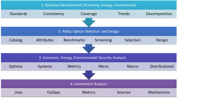 The CCS ISM modeling framework is part of a larger collaboration and analysis process that incorporates CCS facilitated stakeholder and policy maker deliberations into sequentially linked and iterative policy planning and analysis decisions. The policy development and evaluation process is shown schematically in Figure 1. The CCS ISM system enables policy makers to establish clear, policy relevant baseline activities, and then to identi- fy, design and evaluate new integrated measures that maximize economic, security and environmental benefits across all energy and economic sectors and using all policy instruments. In addition, the system provides pol- icy makers with critical system costs/savings and investment requirements, allowing early consideration of fi- nancing measure for implementation. These tools integrate the priorities of economic growth, energy security and environmental benefits (i.e. security and sustainability improvements) into a single policy development process and analytical framework that addresses investment needs.