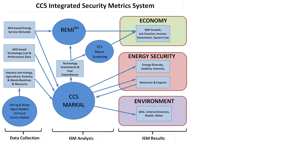 The results handling aspects MARKAL-CCS were enhanced to provide multiple energy security metrics. These include changes in the demand for imported oil, total fuel mix diversity, electric generation fuel mix di- versity, electric grid stability as measured by changes in summer peak demand, and overall national energy in- tensity per unit of GDP.