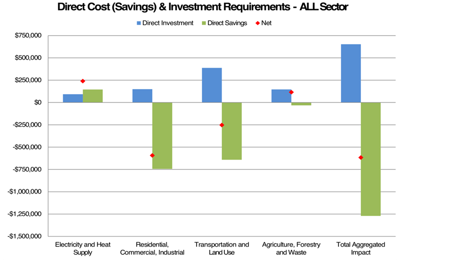 Figure 3 shows the direct investment flow requirements and employment benefits of the policies by economic sector. Also shown is the direct investment cost per full time job (by employee-year) created between now and 2030. Integrated economic, energy, environmental security investment creates jobs at favorable investment rates in comparison to conventional economic development alternatives. The aggregate result over all sectors would create, on average, one job per $24,000 invested. The Residential, Commercial and Industrial (RCI) sector poli- cies are the most cost-effective in this regard, followed by Agriculture, Forestry and Waste (AFW) sector poli- cies. The Transport and Land-Use (TLU) policies are more expensive due to infrastructure costs required by some of the measures, and Electricity and Heat Supply (EHS) investment requirements per job are higher than the average because of the high capital investments required by the renewable energy (biomass, geothermal, hy- dropower, solar and wind) power plants.