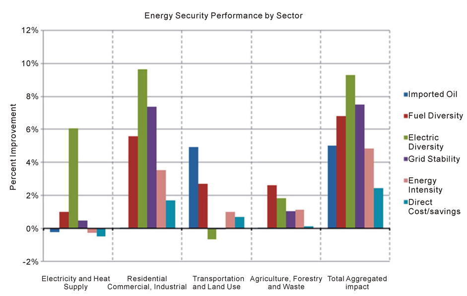 Figure 5 shows the six energy security metrics used in the analysis. While one or two measures in a few sec- tors show slightly negative results, the aggregate metrics are significantly positive. The RCI sector shows the most significant improvements, especially for fuel and electricity diversity, while the TLU sector shows signifi- cant gains due to reduced oil imports. The energy security metrics for each individual measures are presented in Annex 2.