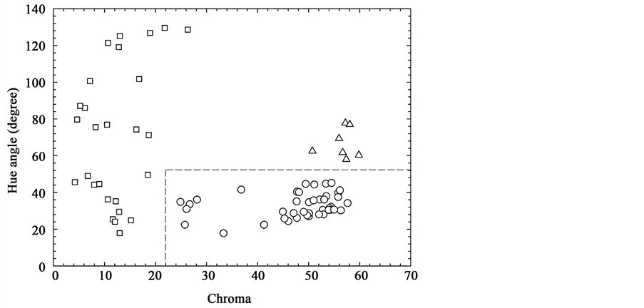Figure 2. Color space values of the region of interest on the surface of mangoes. Circles, triangles, and squares denote red, yellow, and green regions, respectively. Ranges of red were determined using the thresholds at chroma = 22 and at hue angle = 52˚.