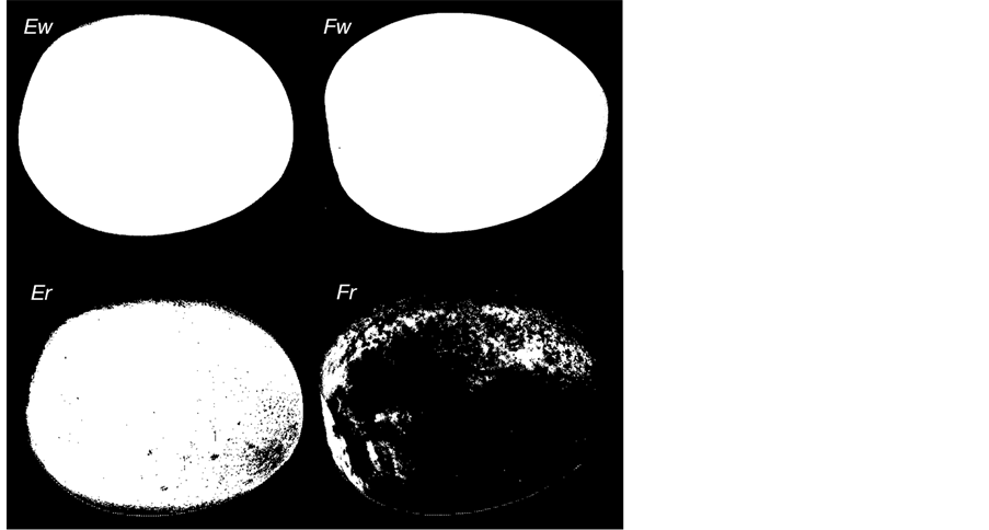 Typical selection results of red color pixels are shown in Figure 3 as binary images. The shares of red pixels in a whole fruit were calculated by dividing the number of pixels for red peel areas in a binary image by the number of pixels for the complete area in a binary image [Equation (3)]. The images expressed as Ew and Er were of a fully-ripened fruit, and those as Fw and Fr were of a green-mature fruit. The difference in the share of red areas between the two fruits was apparent, according to the calculated results.