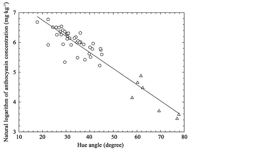 Figure 4. Relationship between hue angle and anthocyanin concentration in mango peels (region of interest). Circles and triangles denote the measured values for red and yellow peels, respectively. The solid line (y = ?0.0542x + 7.83) denotes the linear regression line at a correlation coefficient accuracy of 0.94, root mean square error of 1.31 mg∙kg−1, and p value of <0.0001. Anthocyanin concentration was expressed in fresh weight basis.