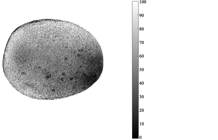 Figure 5. Distribution of anthocyanin on mango peels estimated using a computer vision system. The scale bar denotes anthocyanin concentration (mg∙kg−1) expressed in fresh weight basis.