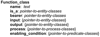 A function has a name and inherits properties from more general specifications in the class hierarchy, here the entity class (Figure 1). It has 5 key properties: bearer, input, output, process and enabling condition. The bearer points to a subsystem, i.e. a material host (a structure consisting of a part of the agroecosystem of interest) subject to changes. The input designates a set of sources of matter or energy required by the underlying processes. The output concerns a set of entities affected or controlled by these processes. The output can be a change of properties (e.g. biomass or population size) of some biophysical entities or the maintenance of properties within suitable conditions (e.g. uninterrupted water flow in the river). It can also be a structural modification (e.g. new element in a set-valued property, new living entities) or maintenance of properties (e.g. habitat quality). The process attribute in a function description can point to an elementary process or, more commonly, an aggregate of processes (depending in particular on the granularity required by the analyst). In some cases the function has no apparent process and the function amounts essentially to a structure that prevents some processes being triggered (e.g. avalanche