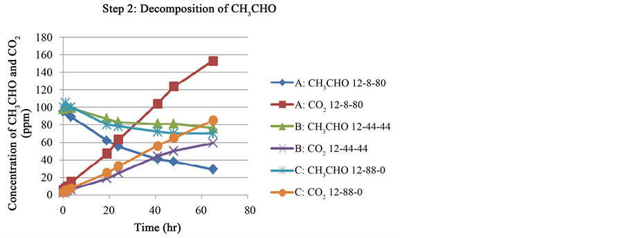 Through Step 1 and Step 2 experimental procedure, the increase in CO2 levels observed in conjunction with a decline in gaseous acetaldehyde indicates the complete oxidation of acetaldehyde. This is important from the viewpoint of practical applications, because acetaldehyde is known to be one of the principal odor-inducing gases indoors, particularly in cigarette smoke [15] [16] .