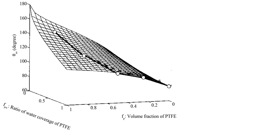 Figure 3. The contact angle θas of water as a function of PTFE volume fraction fp and PTFE coverage of water fpw [17] .
