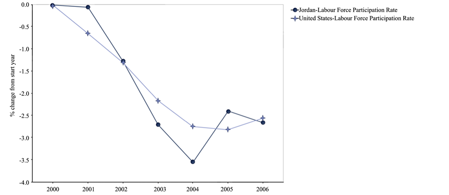The Joint Committee, which is “established to supervise the proper implementation of this agreement and to review the trade relationship between the parties”13, is another characteristic of this agreement. The committee “shall convene at least once a year in regular session in order to review the general functioning of the agreement”. Although the supervisory article is general without reference to labour issues, the Figure 314 illustrates that the labour force participation rate in both US and Jordan declined steadily notwithstanding some fluctuations from 2000 to 2006, which means that forced labour has been controlled effectively.
