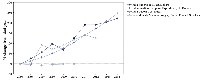 Figure 1. Exports total, final consumption expenditure, labour cost index and monthly minims wages in India.