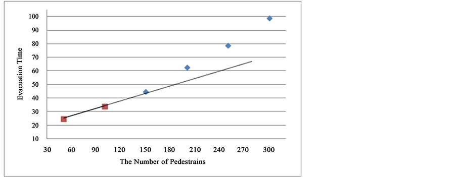 Figure 6 shows that the evacuation time is rising with the number of pedestrians increasing. However, the trend graph indicates that the value of evacuation time is not increasing in proportion to the number of pedestrians. The more increase of the demand of the number of evacuated pedestrians, and the higher congestion in