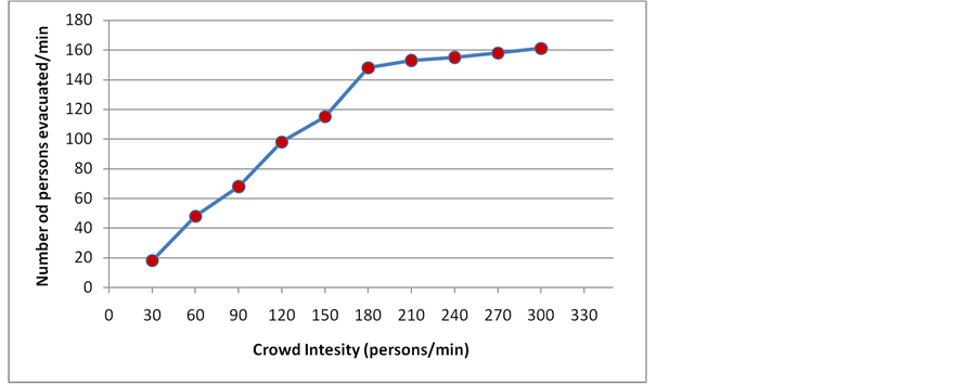 The model is built according to the same parameters with the underground passage, and with a velocity of 1.2 m/s, to conduct the walking velocity and the evacuation simulations as shown in Figure 8 and Figure 9 by setting 10 groups with different intensity of pedestrian flow from 30 to 300 pedestrians are passing the underground passage in one minute.