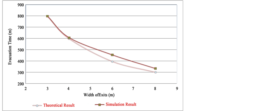 When exits width is 3 m, evacuation time is 798 s, however, when the width increases to 6 m, evacuation time is 396 s. This means that when the width of evacuation exit multiplies, evacuation time doesn’t decrease in equal proportion, but need more time. Therefore, the exit width of the building facilities should be set rationally according to the need of venues.
