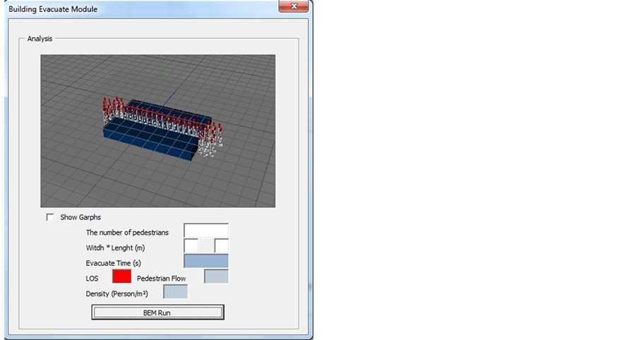 The number of pedestrians is also an important factor. In this case, we assume 50, 100, 150, 200, 250, 300 people separately are evacuated at 1.2 m/s , across the underground passage with length of 20 meter and the width of 2 meter. And the scenario of evacuation simulation is shown in Figure 5 at Building Evacuate Module (BEM).