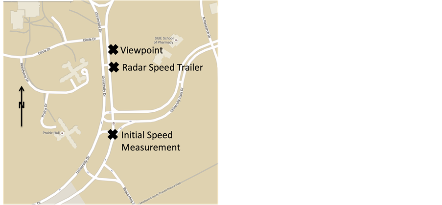 The study location was on the south end of Southern Illinois University Edwardsville campus more than two miles from the nearest signalized intersection and had ideal pedestrian facilities mitigating any effects found to have an impact of safety in past studies [20] . The test approach taken in this research was to record driver speeds as they approached the area of the radar speed display sign and frequented by pedestrians. The researchers used a hand held radar gun to record the vehicle speeds. Lead vehicles were identified and tracked through the study area, no following vehicles were used due to the leading vehicle controlling the speed of all following vehicles. In Figure 1, the location of the initial speed measurement is labeled indicating the point where the radar speed display sign measurement is displayed to the driver. The location where the handheld radar speed measurement was taken can be seen labeled as viewpoint. Drivers were unaware that their speeds were being recorded allowing the data collection team to capture the true driver reaction to radar speed display signs.