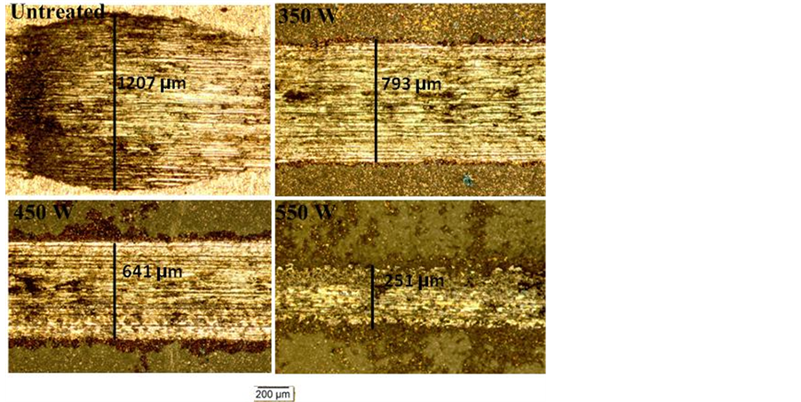 Figure 7. Optical micrograph of wear tracks for the untreated and oxynitrided titanium at different plasma processing-power.