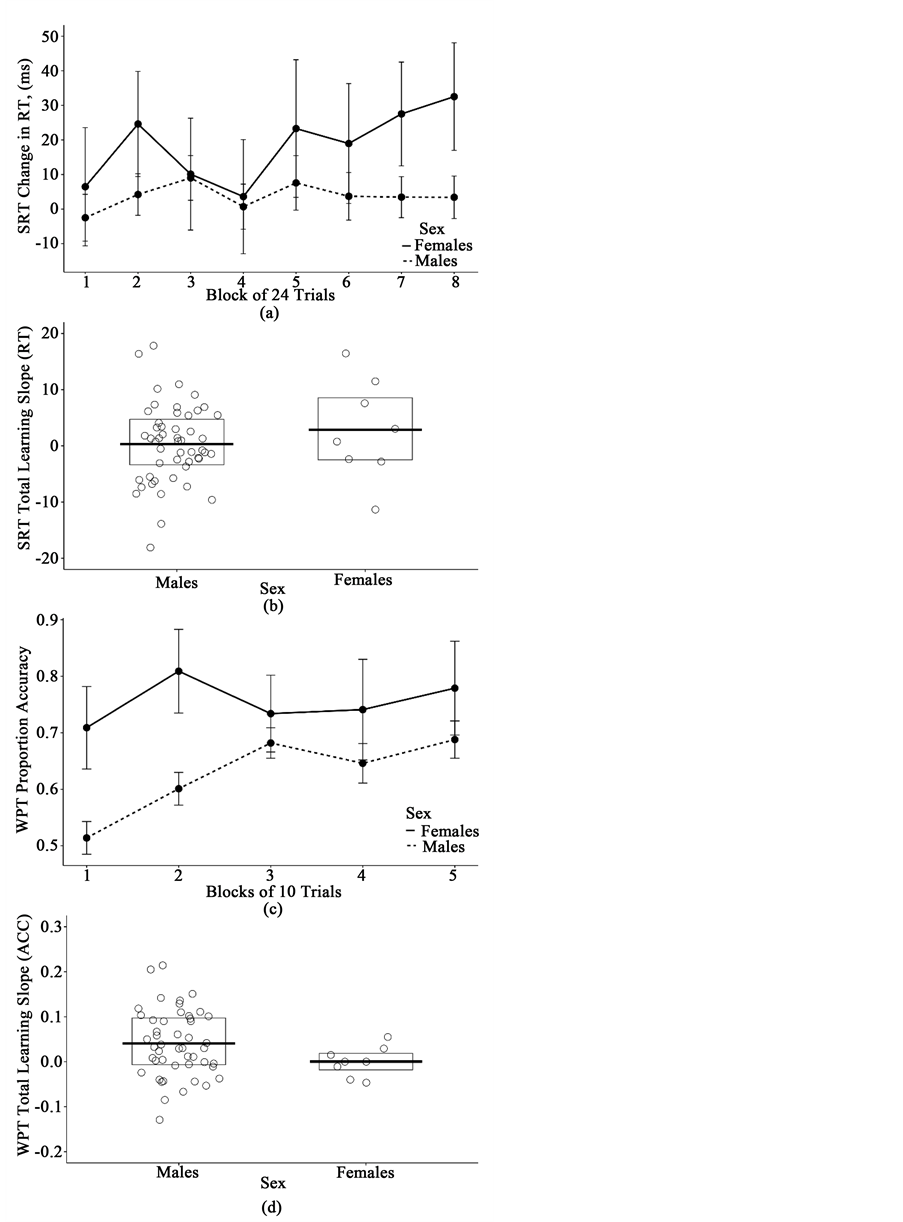 Figure 2. Serial Reaction Time (SRT) task and Weather Prediction Task (WPT) Performance. (a) SRT benefit of males and females across learning. Error bars represent the standard error of the mean; (b) SRT total learning slope for males and females; (c) WPT accuracy of males and females across learning. Error bars represent the standard error of the mean; and (d) WPT total learning slope for males and females.