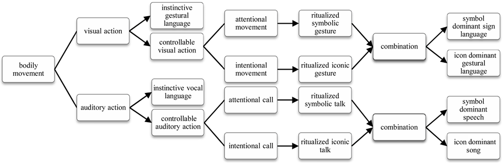 Furthermore, controllable language can be also divided into symbolic language and iconic language [11] . Symbolic language is based on symbols which by themselves have no meaning and specific purpose. Symbol-referent (meaning of symbol) has arbitrary relationship. Iconic language is based on icons which by themselves represent certain meaning and specific purpose. Icon-referent (meaning of icon) has deliberate relationship. As a result, the four controllable languages are ritualized symbolic gesture, ritualized iconic gesture, ritualized symbolic talk, and ritualized iconic talk. Symbolic languages and iconic languages can be combined into symbol dominant sign language, icon dominant gestural language, symbol dominant speech, and icon dominant song. Consequently, there are six language types including two instinctive language types and four controllable language types.