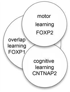 FOXP2 mutations (defects) cause speech disorders shown in the people with the FOXP2 mutations [37] . Speech disorder is a linguistic motor disorder. Mutations in CNTNAP2 can produce speech problems, autistic phenotypes, intellectual disability, and epilepsy [38] . Autistic phenotypes, intellectual disability, and epilepsy are cognitive disorders. The mice without CNTNAP2 had disordered neuronal phenotypes (altered neuronal firing and seizures), improved motor coordination, reduced social interactions, and increased repetitive behavior [39] . The FOXP1 gene is closely related to FOXP2. Unlike individuals with FOXP2 mutations, the individuals with FOXP1 mutations display autism spectrum disorder, mild to moderate intellectual disabilities and motor impairments in addition to speech problem [40] . FOXP1 mutations show the overlapping of both motor and cognition disorders. In the mapping of the distribution of linguistic genes in the bats [32] , the expressions of CNTNAP2 often showed an inverse pattern to the expressions of FOXP2. The expressions of FOXP1 located in more brain regions than the expressions of FOXP2.