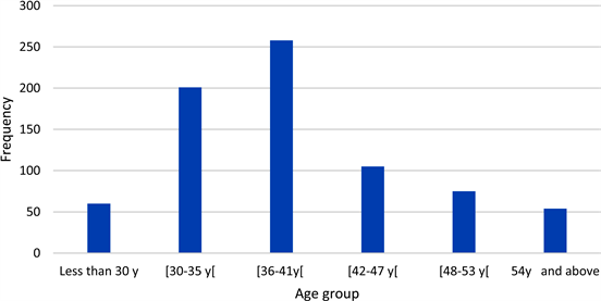 A total of 753 workers were enrolled. There were 663 men (88.04%) and 90 women (11.96%), giving a sex ratio of 7:37. The mean age of the study population was 39 years, with a minimum of 26 years and a maximum of 56 years (Figure 1).