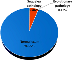 Of the 753 radiographs obtained, 712 were normal (94.55%), while 41 X-rays (5.44%) showed abnormalities (Table 2), thus 14 cases (1.85%) of blunting of left costophrenic angle, 9 cases (1.19%) bunting of right costophrenic angle, 8 cases (1.06%) of cardiomegaly, 3 cases (0.39%) of basal infiltrate, 6 cases (0.79%) of apical infiltrate and one case (0.13%) of right pleural liquid effusion of mean abundance with right para-tracheal opacity. Among these abnormalities 40 cases (5.31%) were considered sequelae and one case (0.13%) as evolutionary (Figure 2).