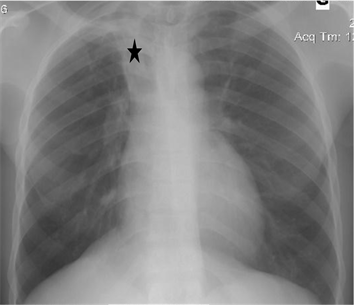 Figure 5. Moderate right pleural effusion (red arrow), anterior superior right paratracheal opacity (black star) and right hilary opacity (red star).