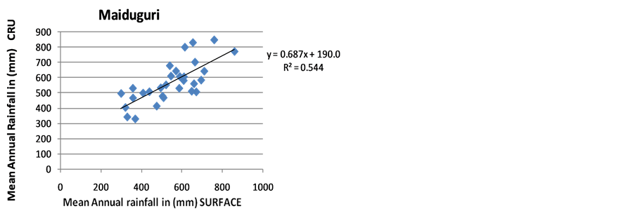 Figure 2. (a)-(c) Simple linear regression analysis showing relationship between CRU rainfall data and NIMET’s rainfall data for Maiduguri, Kaduna and Ibi.