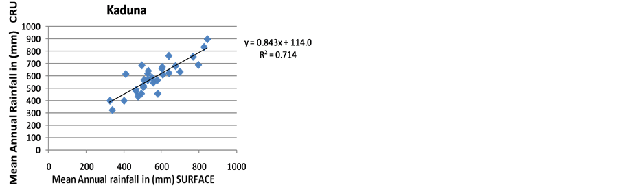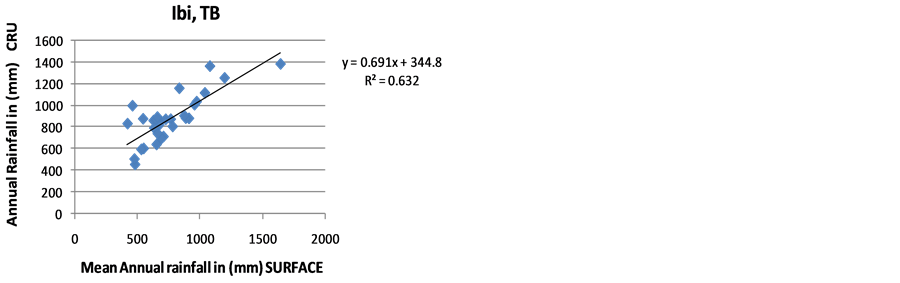 CRU data is a global data, therefore it was necessary for the data to be validated. This was done by using the 30 year surface monthly rainfall data (1971-2000). The surface data was obtained from the archives of the Nigerian Meteorological Agency, Lagos Nigeria (NIMET). The monthly mean CRU data was validated with the Monthly mean surface data by using simple linear regression analysis [17] . Validation was done for 3 selected stations (i.e. a station per ecological zone) within the study area.