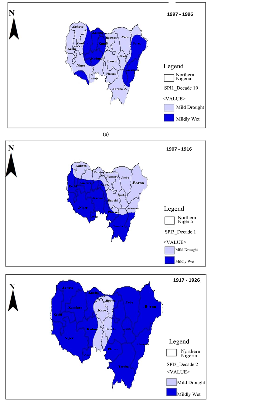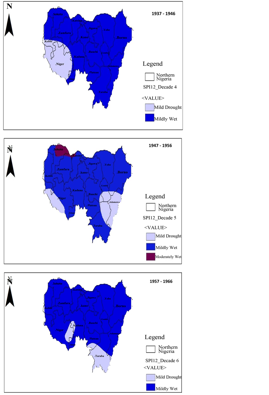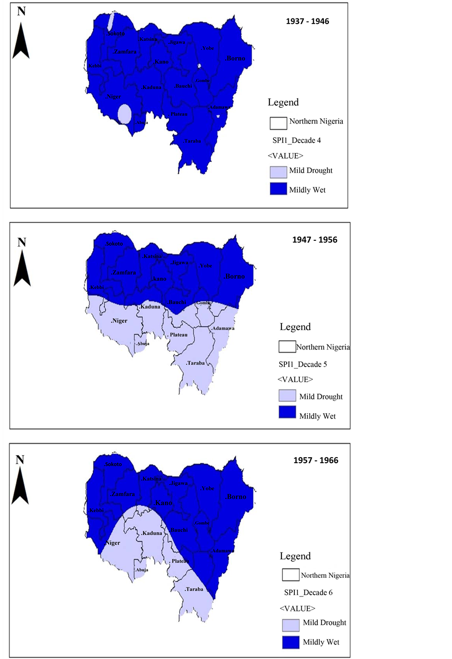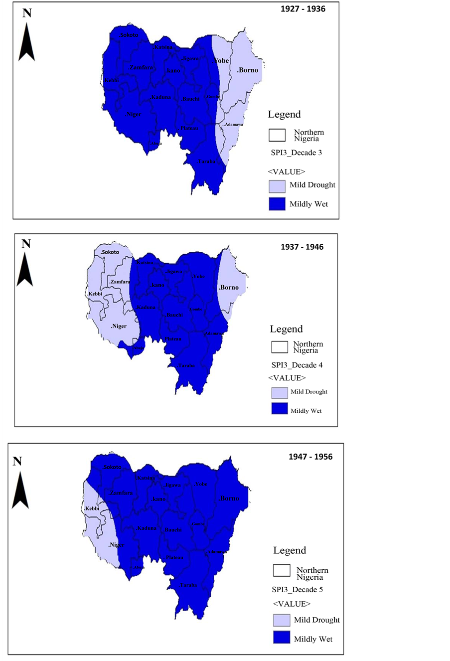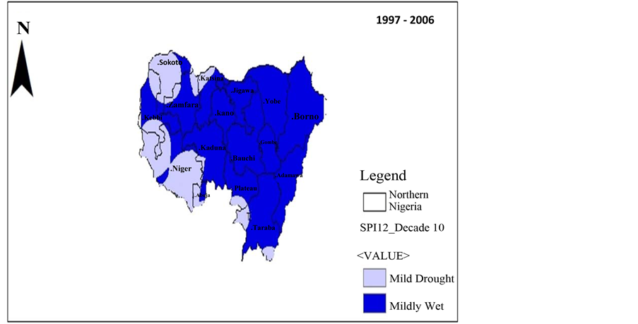 wet condition. There was reduced rainfall receipt in Kano and Parts of Jigawa, Kaduna and Bauchi leading to mild drought over these states in decade 2 while other mildly wet was observed in other parts of the study area. Borno, Adamawa, parts of Yobe and Taraba experienced mild drought in decade 3 while mildly wet was observed in other parts of the study Area. In decade 4, mild drought was observed over Sokoto, Kebbi, Niger, parts of Zamfara and Borno States while Mild drought was observed in other parts of the study area. In the fifth decade, mild drought covers less area (parts of Kebbi and Niger) while mildly wet was observed in other portion of Northern Nigeria.