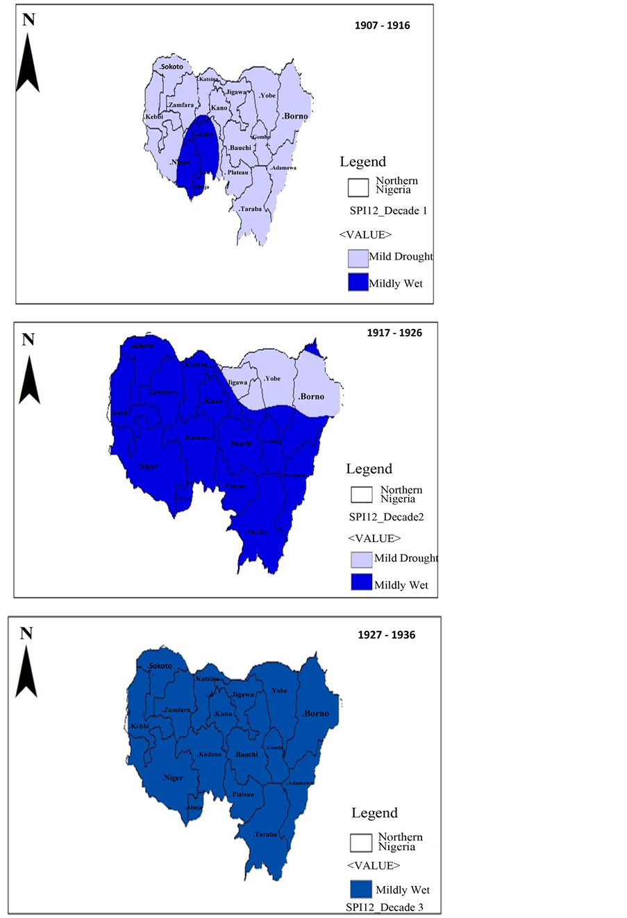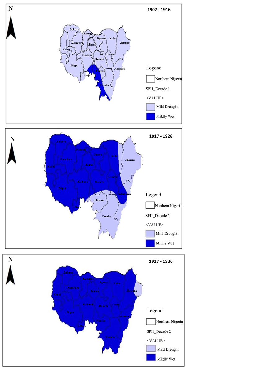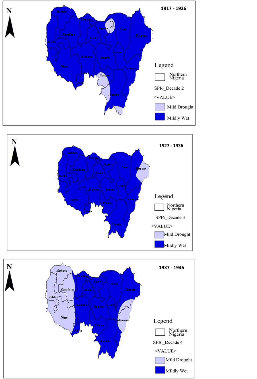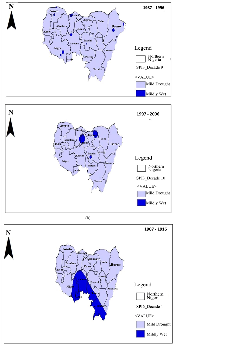 wet condition. There was reduced rainfall receipt in Kano and Parts of Jigawa, Kaduna and Bauchi leading to mild drought over these states in decade 2 while other mildly wet was observed in other parts of the study area. Borno, Adamawa, parts of Yobe and Taraba experienced mild drought in decade 3 while mildly wet was observed in other parts of the study Area. In decade 4, mild drought was observed over Sokoto, Kebbi, Niger, parts of Zamfara and Borno States while Mild drought was observed in other parts of the study area. In the fifth decade, mild drought covers less area (parts of Kebbi and Niger) while mildly wet was observed in other portion of Northern Nigeria.