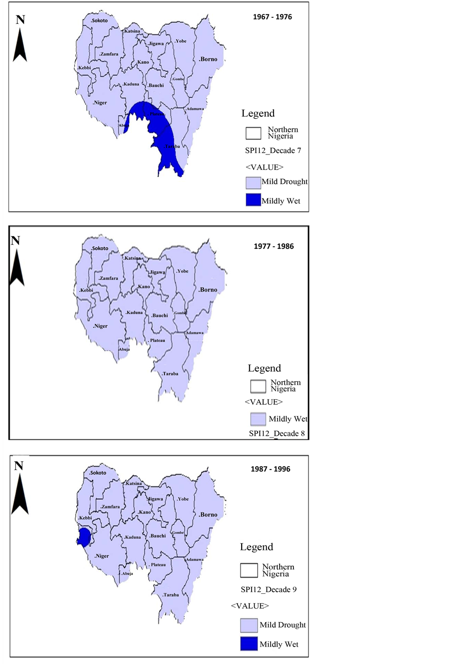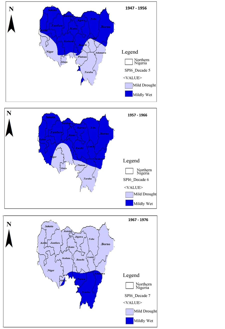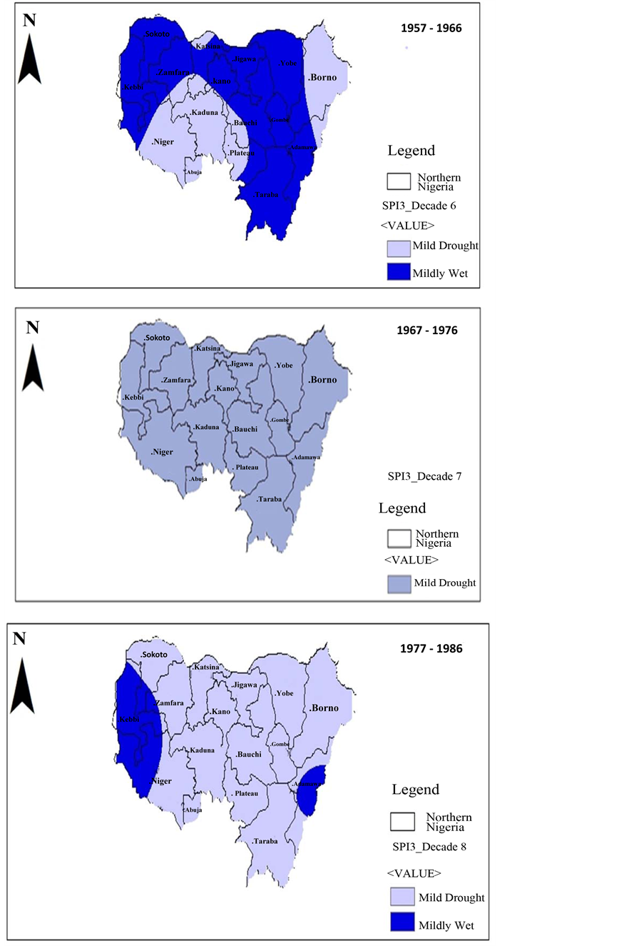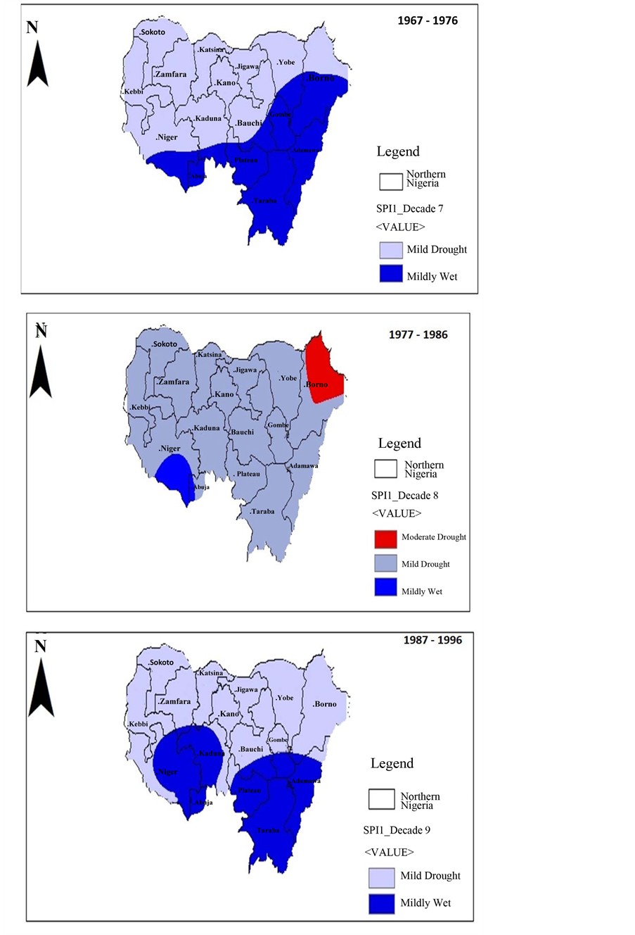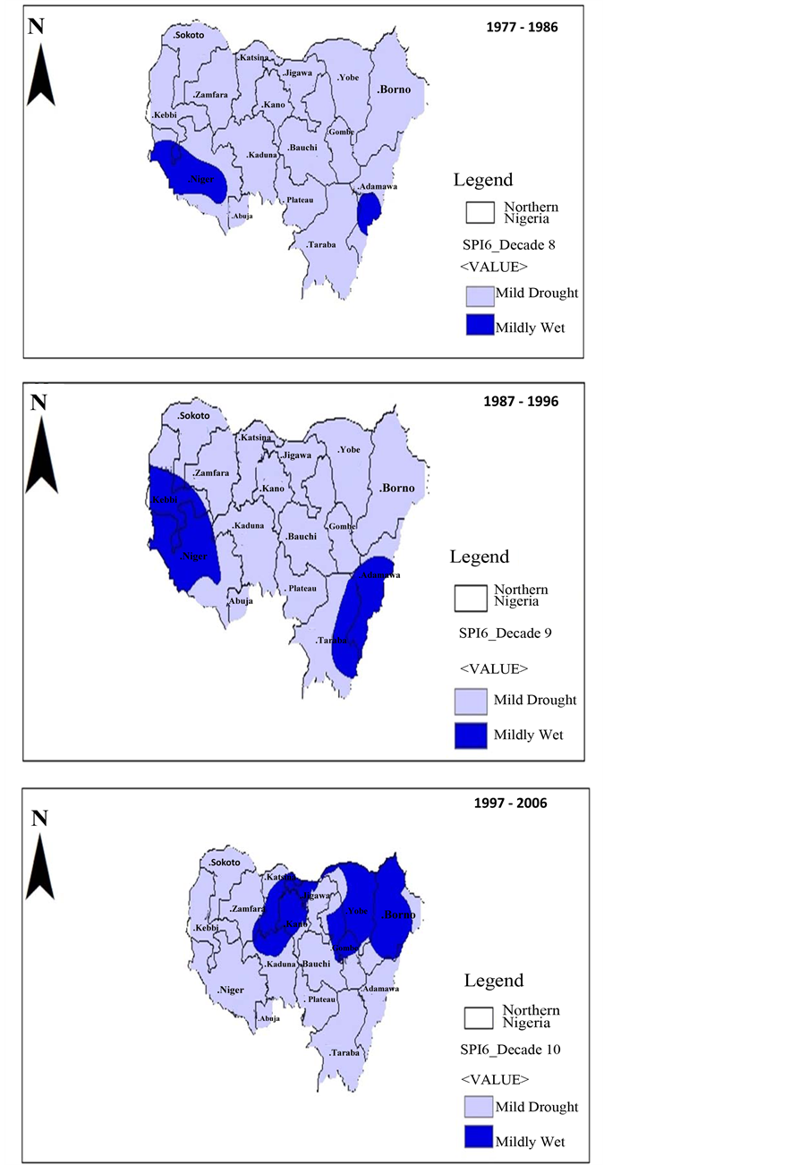 In decade 6, mild drought was observed in Niger, Kaduna, Borno and parts of plateau while other parts are of mildly wet. Perpetual dryness was observed between decade 7 and decade 10 over parts of Northern Nigeria, early rainfall reduced leading to mild drought in most parts of the study area in the last four decade except in Kebbi, parts of Niger and Adamawa in decade 8.