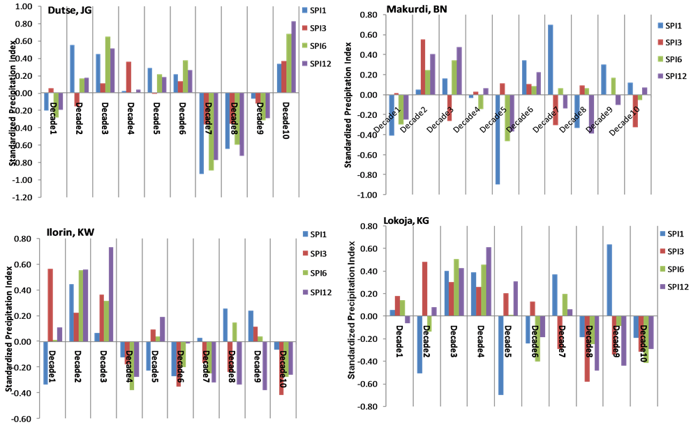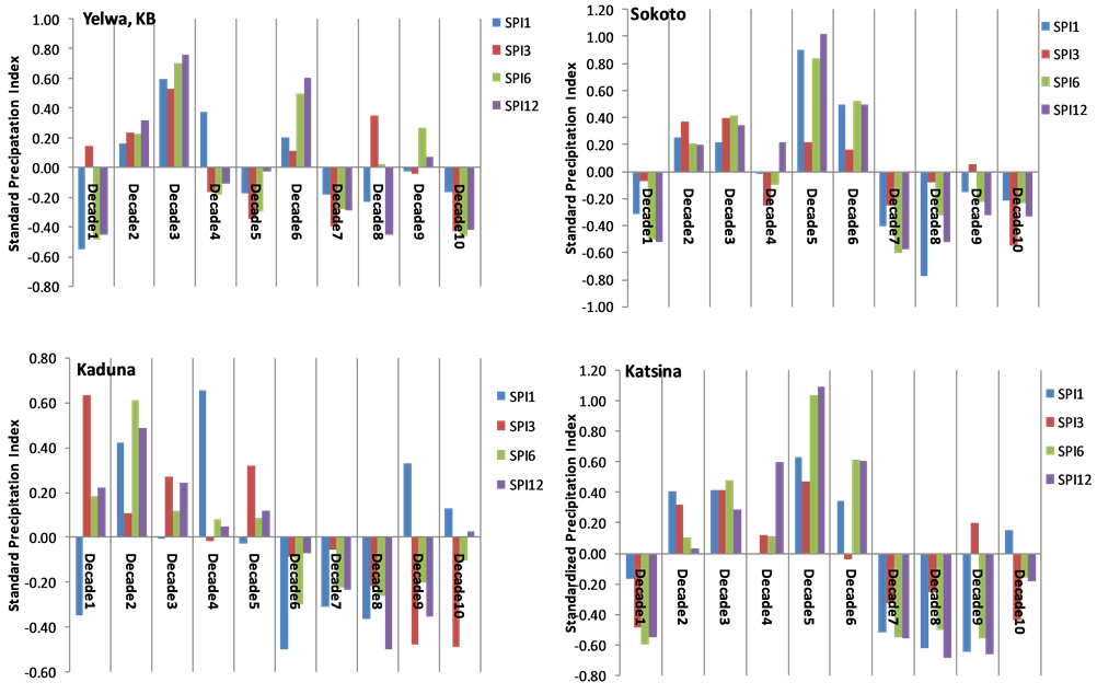 This study therefore confirmed that there is no coherent time pattern to the occurrence of drought. It also confirmed the high intensity of droughts in the decade 8. The analysis showed some stations to be on what can be termed recovery (Kano, for example) to wet situations in the last two decades. This study proves the need to put measures in place that are likely to be used to tackle and ameliorate the impact of drought when they next re-occur.