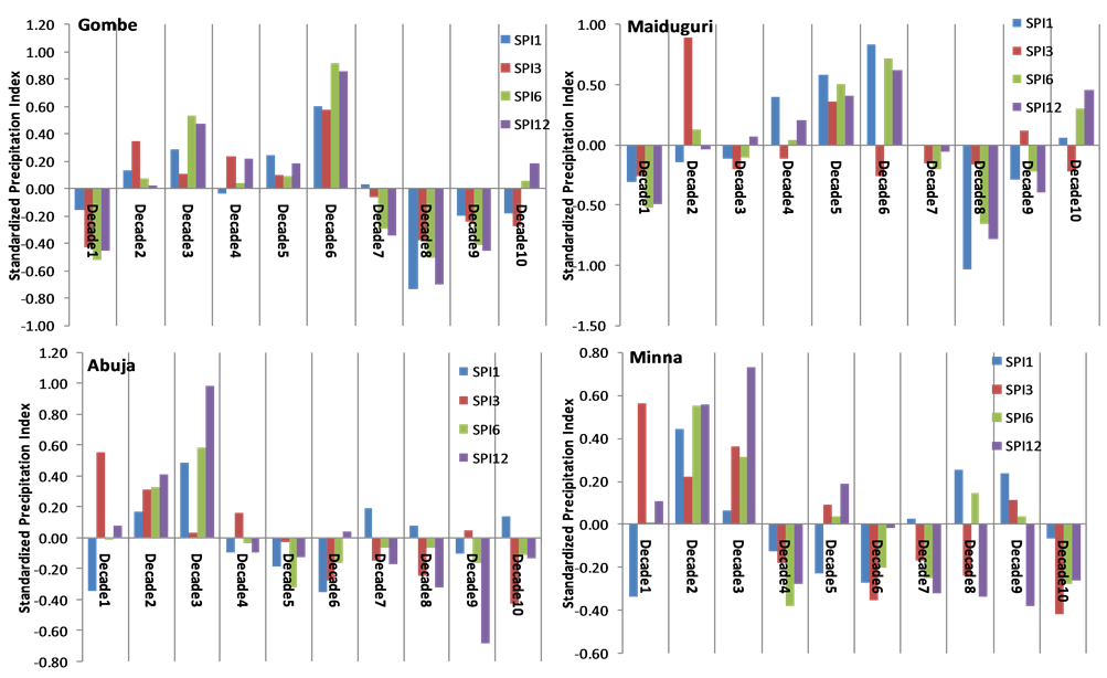 Abuja observed negative anomaly irrespective of the SPI time-scales only in decade 5 as shown in Figure 4(b). Minna experienced drought irrespective of SPI time-scales in decades 4, 6 and 10 whereas Gombe observed negative anomalies in decades 1, 8, and 9 irrespective of the SPI time-scales Decade 7 also witnessed negative SPI values. Over Maiduguri, decades, 1, 3, 7, 8, 9 experienced great deal of negatives anomalies in their SPI time-scales only that decades 3 and 9 showed positive trend in 12 month and 3 month SPI respectively.