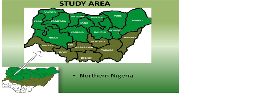The northern region of Nigeria is located between latitude 8˚N and 14˚N and longitude 4˚E and 14˚E. The regions are as follow (Figure 1); Kebbi, Sokoto, Zamfara, Katsina, Kano, Jigawa, Yobe, Borno, Niger, Kaduna, Bauchi, Kwara, Kogi, Abuja, Nasarawa, Benue, Plateau, Taraba and Adamawa. All the regions have two distinctive seasons: wet and dry seasons. Rainfall in this region is highly variable and onset of the rain is erratic. The rainfall intensity is very high between months of July and August. The southern region of Nigeria receives more rain and is less vulnerable compared to the northern region.