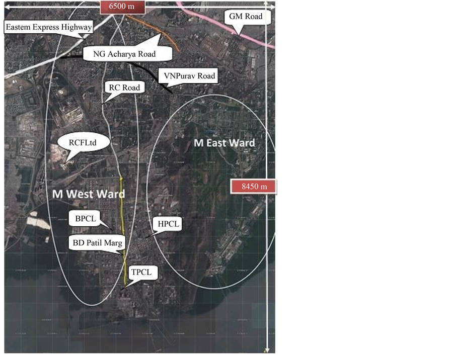 Chembur is a highly polluted region by industries as well as vehicles. Its latitude and longitude are 19.05˚N and 72.89˚E respectively. The study area is 6.5 kilometres east-to-west and 8.45 kilometres north-to-south as shown in Figure 1. It contains heavy duty vehicles on Port Trust Road, Mahul Road and Ramakrishna Chemburkar Marg. Due to continuous movement of heavy vehicles, road conditions are getting worse. It has four major industries such as two refineries (BPCL and HPCL), a fertilizer (RCFL) and a power plant (TPCL). WRF model