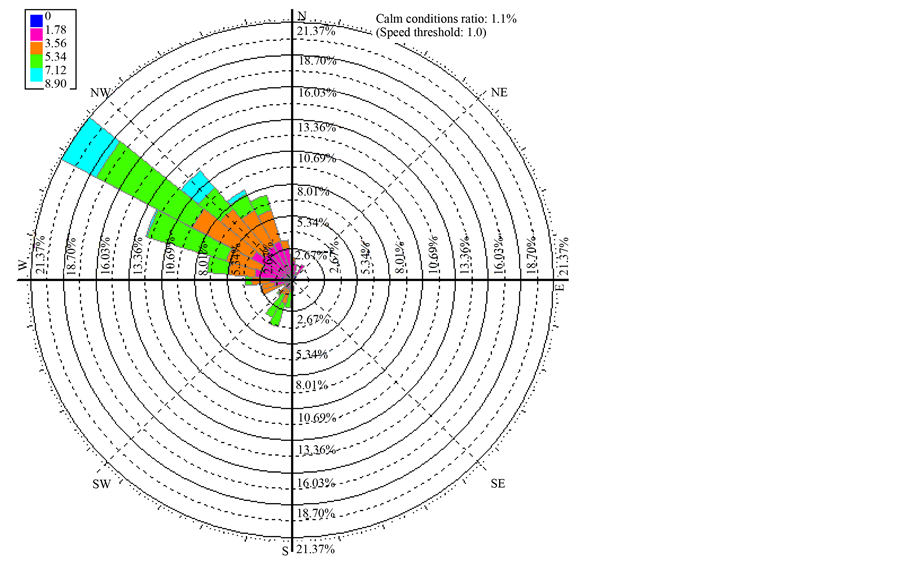 calm condition was 1.1% of time where 1 m/s was wind speed threshold. A very low frequency of wind is from south-west direction with wind speed around 5 m/s.