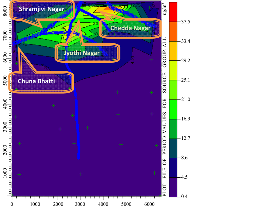 Figure 3 shows NOx concentration by vehicles in the study area. The north part of study area has high density of vehicles and is dominated by vehicular sources. Maximum concentration of NOx is 38 µg/m3 in Chedda Nagar. Around 15 to 25 µg/m3 NOx concentrations are in Shramjivi Nagar and Jyothi Nagar which are in the north part of the study domain. In May, 2011, wind profile shows that maximum period of time, wind is blowing from north-west corner, so pollutant concentration is high in the north direction of study area and Chuna Bhati has lowest concentration as 10 µg/m3.