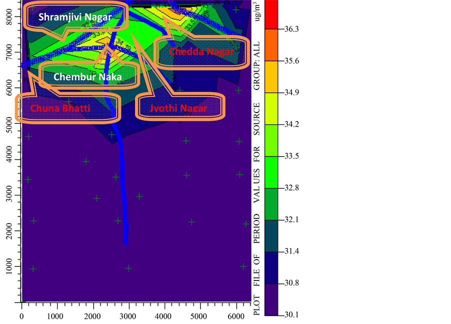 Figure 4 shows contour plot of PM concentration from vehicles in the study area. The north part of study area is dominated by vehicular sources. Maximum concentration of PM is 36 µg/m3 in Chembur Naka and Chedda Nagar near Ghatkopar-Mankhurd Road. Shramjivi Nagar and Jyothi Nagar have almost 32 to 34 µg/m3 concentrations. In May 2011, wind profile shows that maximum period of time, wind is blowing from north-west corner so, pollutant concentration is being transported to north part of study area and Chuna Bhati has lowest concentration 31 µg/m3. In the modelling of PM emission 30 µg/m3 has been taken background concentration which includes resuspended particulate matter based on the work done earlier (Kumar, 2012).