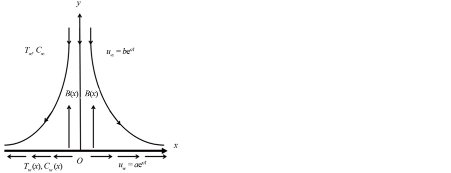 , respectively. Where a > 0 and b are constants, x is the coordinate measure along the stretching surface and l is length of the sheet. A non-uniform transverse magnetic field of strength
