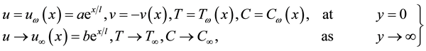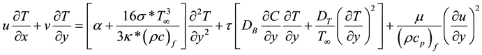 The governing boundary layer equations of the conservation Law of mass, momentum, energy and concentration in the flow as follows: