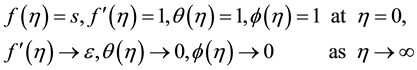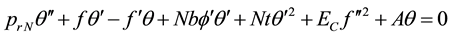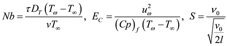 where Nb is the Brownian motion parameter and Nt is the thermophoresis parameter, Ec Eckert number, γ is chemical reaction parameter; The corresponding boundary conditions Equation (8) are transformed into