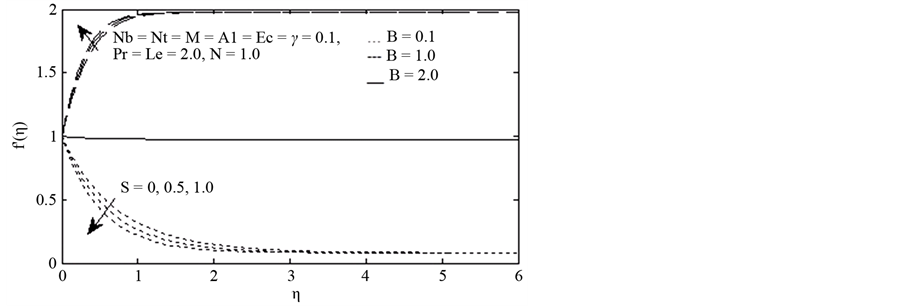 layer reduces. When B = 1, there is no influence of source on f′(η) and f′(η) attains a constant value of “1” for any values of η indicating that there is no boundary layer of fluid, as shown by a thick (-) line in Figure 2.
