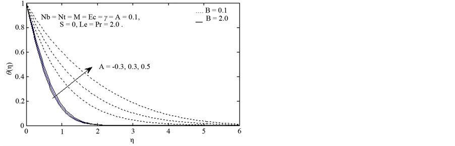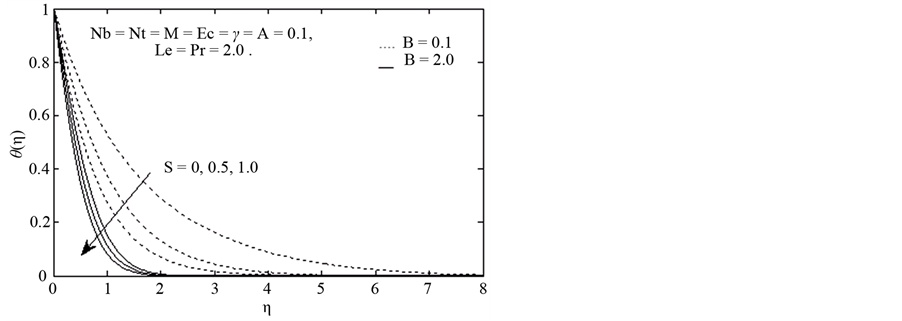 Figure 3 and Figure 4 demonstrate the effects of suction parameter on temperature and concentration. It is clear that the fluid velocity decreases significantly with increasing values of suction parameter while it is found to enhance with blowing. The presence of suction would result in the reduction of the thickness of the boundary layer. So the Nano fluid temperature and concentration decreases with an increase in the suction parameter.