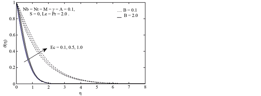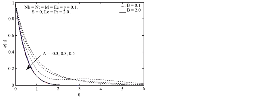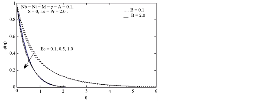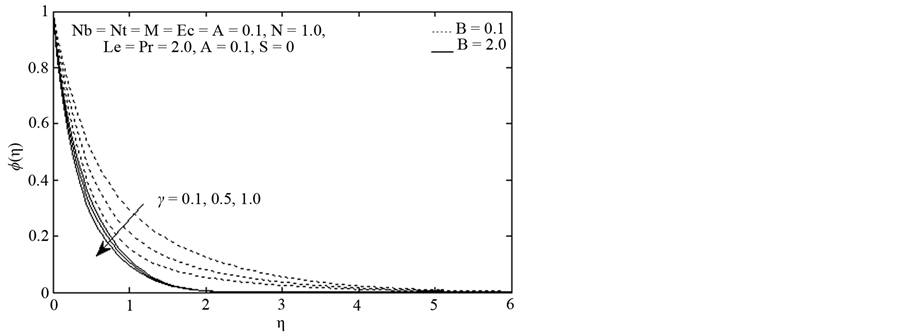 The influence of chemical reaction parameter “γ” on concentration profile is shown in Figure 9. Concentration decreases with an increase in the chemical reaction parameter indicating that the nanoparticle volume fraction decreases with the increase of chemical reaction parameter, while effect of chemical reaction parameter γ is