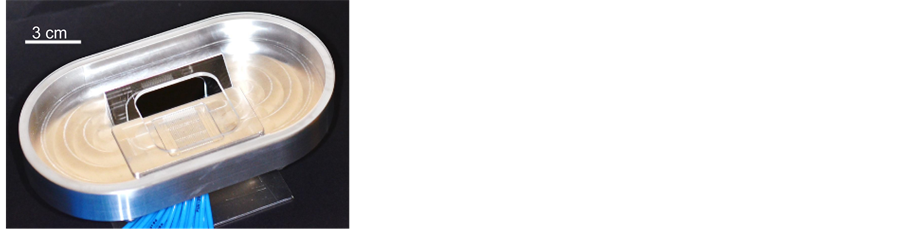 The port with the ciliated membrane is integrated at the bottom of an open channel which is filled with water (see Figure 2). The open channel is 10 mm deep and is made of aluminum. It consists of two straight parts connected by semi-circular arches. Transparent glass windows are implemented into the sides of the channel walls to allow optical access with a high-speed camera (HS-C2 in Figure 3). An optional second camera can look via a 45˚ prism from top onto the ciliated wall (HS-C1 in Figure 3). The cameras are synchronized with each other while recording. Illumination is done with a LED-lighting system.