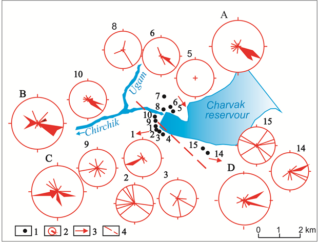 Figure 1. Roses of the directions of shifts of mountain masses in local volumes of points of observations and certain sites of a coastal zone of the Charvak reservoir according to geological observations.