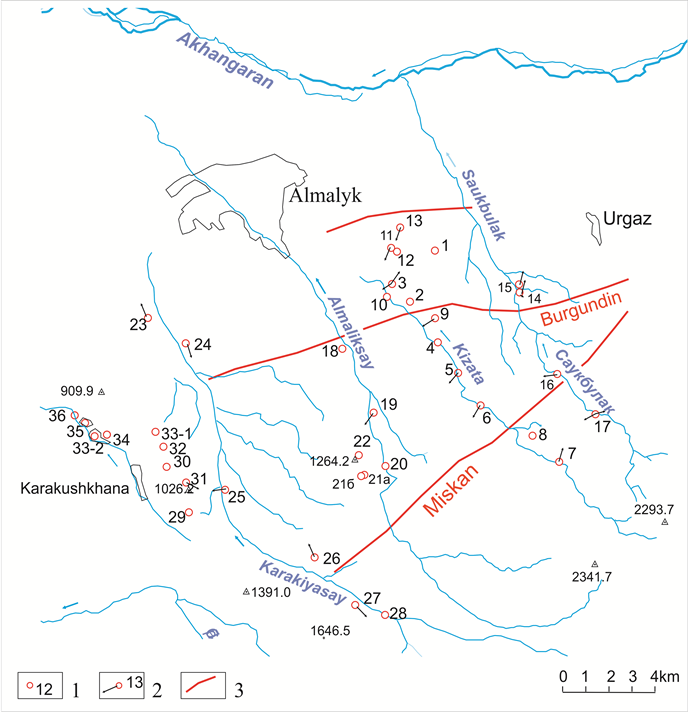 Similar researches have been conducted by us in the Almalyk mining district, on the square to the west from Urgaz (Figure 2). This area is in limits of northwest slopes of Kurama Ridge Tien Shan. Massifs of rocks are presented by paleozoic sedimentary, magmatic, volcanogenic and sedimentary formations of the lower and average carbon fabrics to a large extent, and in smaller―the lower perm. In a middle part of valleys of the rivers Almalyk Saukbulak in the width direction is stretched a large zone of the Burgundin break.