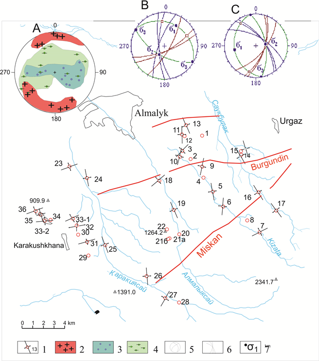 Figure 3. The scheme of orientations of axes of the main normal tension in local volumes of points of observations and charts of axes of tension of the lowest ranks, generalized for different volumes, according to geological data (A―for the considered massif of rocks of the Almalyk district on sliding mirrors; B and С regional, according to the statistical analysis of jointing [9] : B―summary for the western part of Tien Shan, С―for Chatkal-Kurama mountain area).