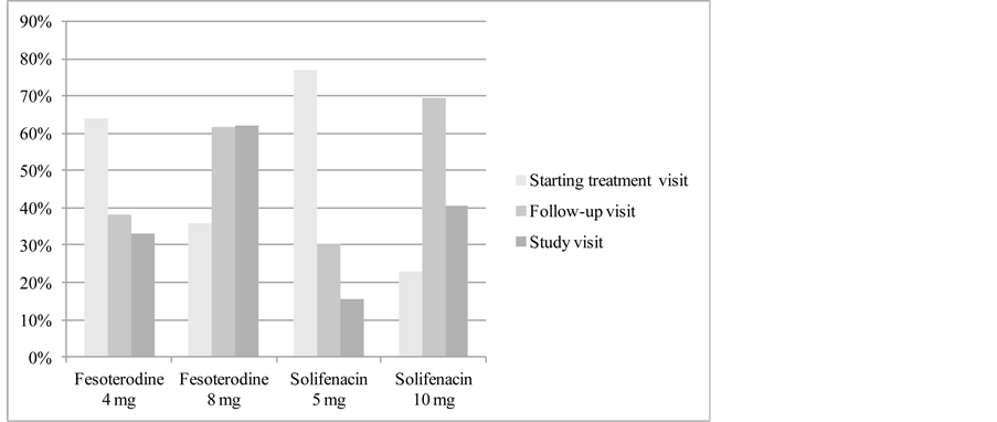In the present study most of the patients initiated the OAB treatment with the lowest available dose, as is recommended. At the follow-up visit, however, more than half opted for dose escalation, whereas only around 20% of those who initiated with the highest dose decided to decrease it. Our findings, stemming from the usual clinical practice, were in line with those reported in previous flexible-dose trials [6] [25] - [30] .