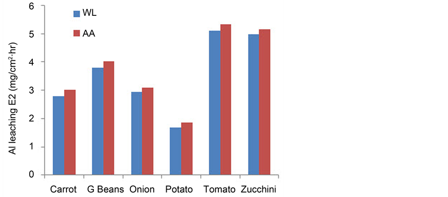 To be sure that the amount of Al3+ detected by AA comes only from Al cookware leaching using the Indian alloy, AA experiments were done for the DW used and the blank vegetable solutions. The concentrations of Al3+ were below the detection limit of the instruments (ppm range). Thus the concentrations of Al3+ calculated for the test solutions are due to Al leaching from Al cook wares only. The analysis of the Al3+ ions dissolved in the test solutions by AA are calculated in ppm (mg/L) using a standard Al solution. To compare the AA results with the WL data, the results from AA were multiplied by the appropriate dilution factor then they were divided by the area of Al sample used. As an example, 30% w/v of the vegetable solutions were analysed by AA. The results of WL and AA are shown in Figure 2. A good consistency was observed between the data from WL and AA with WL being lower in all solutions as the extent of detection of AA is in the ppm range.